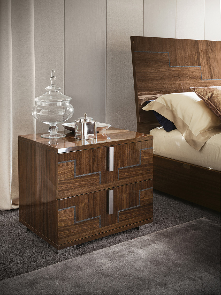 Mesita de noche en nuez canaletto y gris alto brillo. Tiradores y patas en acero.
