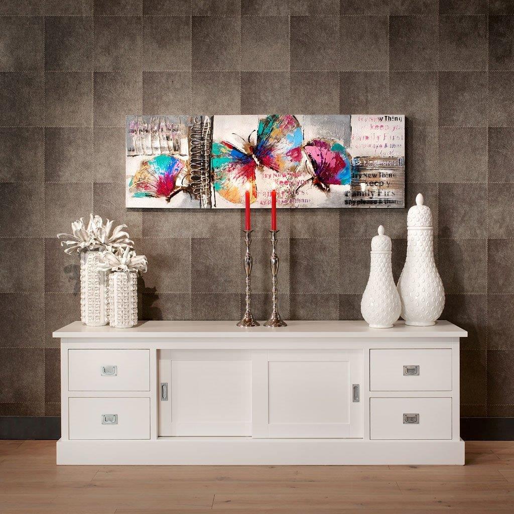 Mesa de TV realizada en pino de alta calidad con dos puertas correrderas y cuatro cajones.