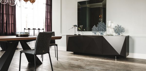 Aparador de 2 o 3 puertas en madera lacada blanco brillo, negro brillo, moka brillo, rojo brillo, graphite mate o titanio. Patas en acero inox brillo, barnizado blanco mate o graphite mate. Estantes interiores en cristal transparente. Cajón interior en la versión 3 puertas.