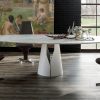 Mesa con base en acero barnizado gofrado blanco, negro o graphite. Sobre en madera nogal Canaletto, roble ahumado o en mármol blanco Carrara mate.
