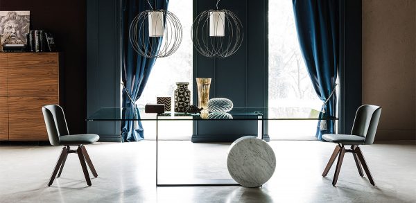 Consola con base en acero barnizado transparente, cobre, gofrado blanco o graphite. Cilindro en mármol Travertino o blanco Carrara. Sobre en cristal 15mm transparente.